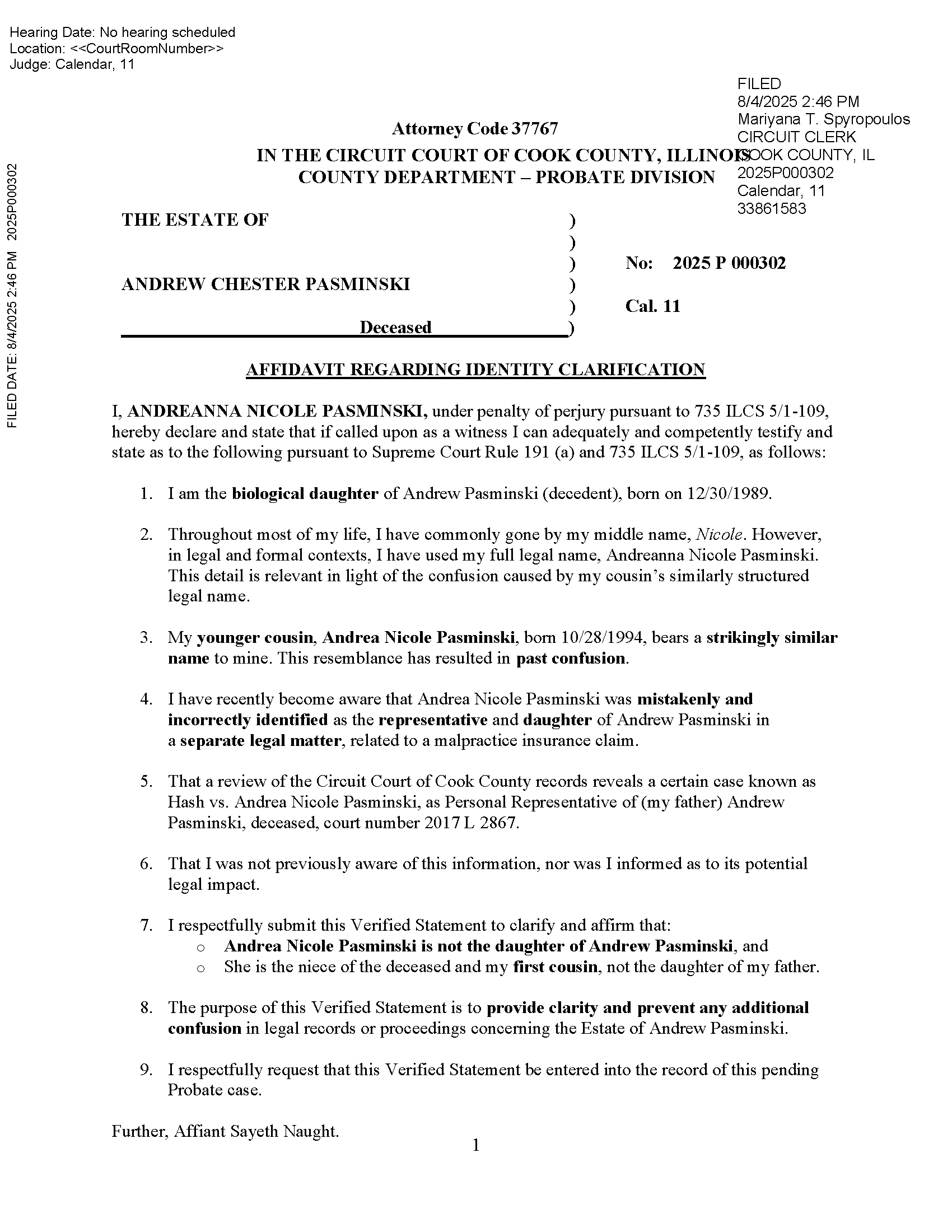 The purpose of this Verified Statement is to provide clarity and prevent any additional confusion in legal records or proceedings concerning the Estate of Andrew Pasminski.
